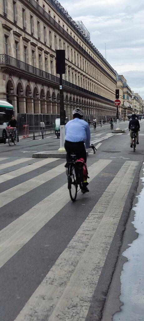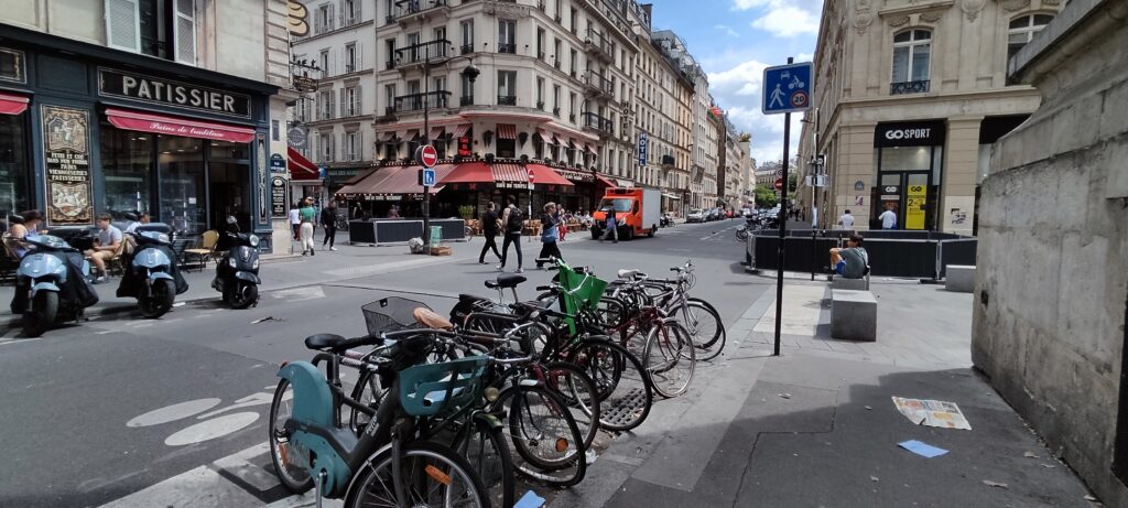 In vielen Vierteln der Stadt teilen sich jetzt Fußgänger, Radverkehr und PKW mit max. 20 km/h die Straße. Das wirkt wuselig aber nicht gefährlich. Andere Straßen entlang der Seine oder am Louvre sind ganz autofrei.