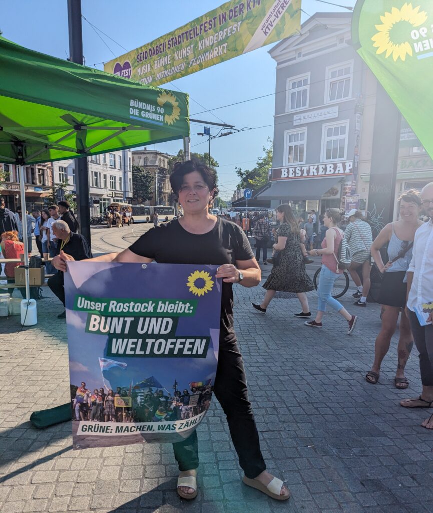 Am 09. Juni 2024 wurde die neue Bürgerschaft in Rostock gewählt. Ich habe mit vielen tollen Grünen Mitgliedern einen engagierten Kommunalwahlkampf gemacht. Ich stand an Infoständen (wie hier auf dem Doberaner Platz am 01. Juni 2024 mit meinem Lieblingsplakat), habe Haustürwahlkampf gemacht und ich habe auch für die Rostocker Bürgerschaft kandidiert.