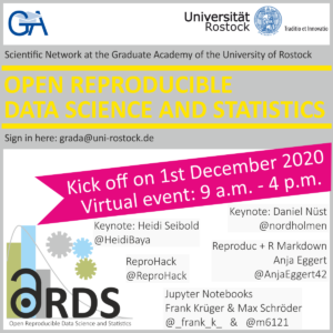 We had two inspiring keynotes by Heidi Seibold on “Let’s become open science champions” and Daniel Nüst “Reproducibility and peer review”. People could also get some training in workshops on “Reproducible statistical data analysis with R and RMarkdown” and “Reproducible data science with Jupyter notebooks” offered by myself and Frank Krüger & Max Schröder, respectively.